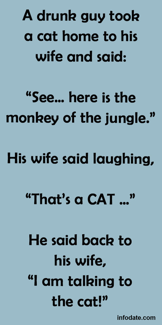 A Guy Took A Cat Home To His Wife. – November 15, 2025 by admin Facebook Twitter Pinterest WhatsApp0sharesA drunk guy took a cat home to his wife and said: “See… here is the monkey of the jungle.” His wife said laughing, “That’s a CAT …” He said back to his wife, “I am talking to the cat!” Facebook Twitter Pinterest WhatsApp0shares