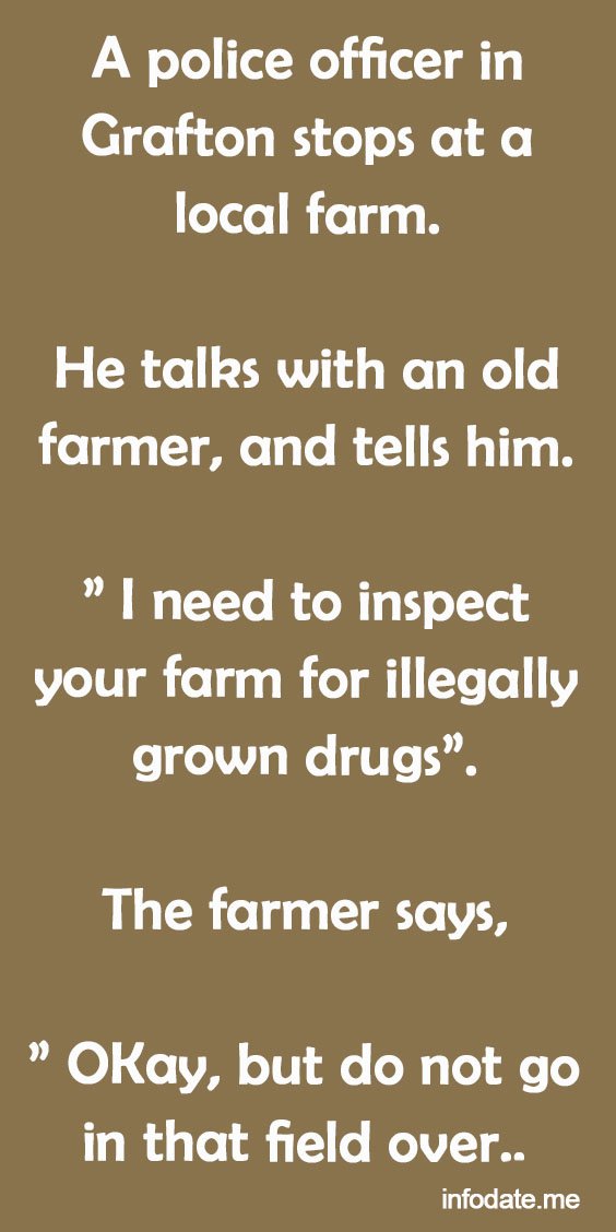 A short time later the old farmer hears loud screaming, looks up and sees the police officer running in front of the farmers Santa Gertrudis bull.