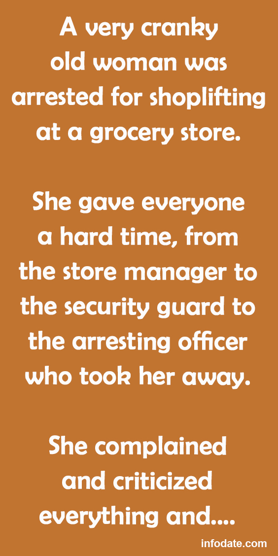 A very cranky old woman was arrested for shoplifting at a grocery store.