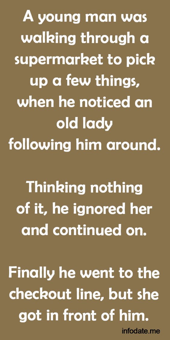 A young man was walking through a supermarket to pick up a few things, when he noticed an old lady following him around.