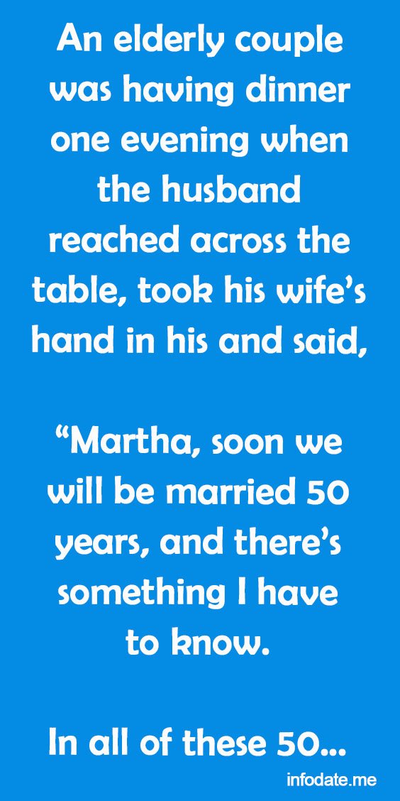“Martha, soon we will be married 50 years, and there’s something I have to know. In all of these 50 years, have you ever been unfaithful to me?”