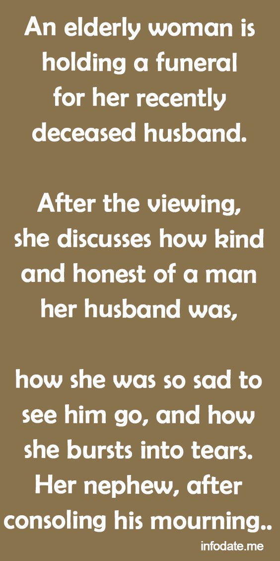 After the viewing, she discusses how kind and honest of a man her husband was, how she was so sad to see him go, and how she bursts into tears.