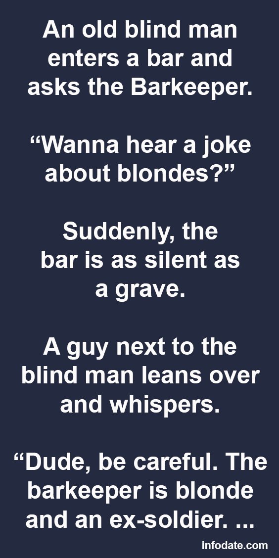 The old blind man takes a minute to think about that, turns on his bar chair and says