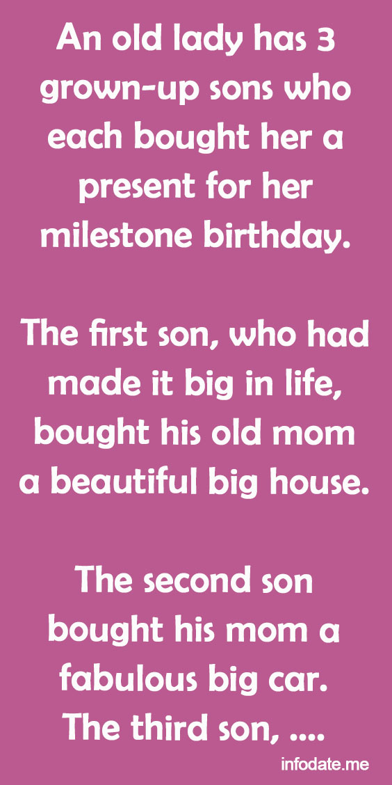 An old lady has 3 grown-up sons who each bought her a present for her milestone birthday.