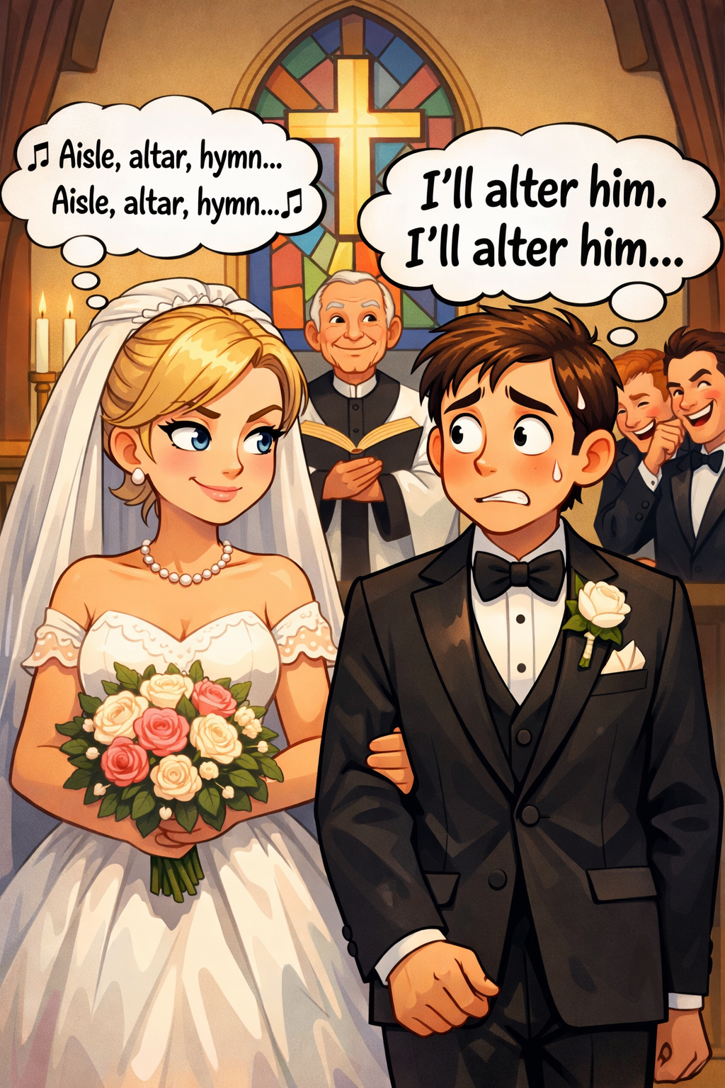 When she arrived and stood alongside him, he heard her quietly repeating to herself, “Aisle, altar, hymn, aisle, altar, hymn.” At that very moment, the bridegroom realized that his friends who had warned him about marriage were correct, as her thoughts, which he could now hear quite clearly, “I’ll alter him. I’ll alter him.”
