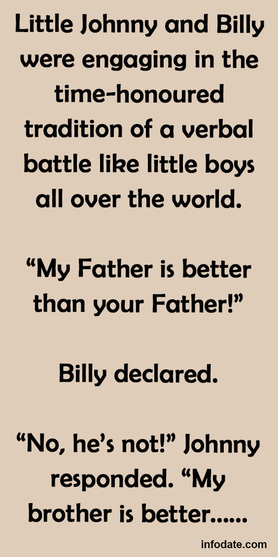 Little Johnny and Billy were engaging in the time-honoured tradition of a verbal battle like little boys all over the world.