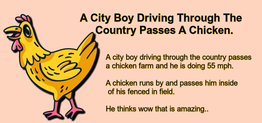A city boy driving through the country passes a chicken farm and he is doing 55 mph. A chicken runs … Read more