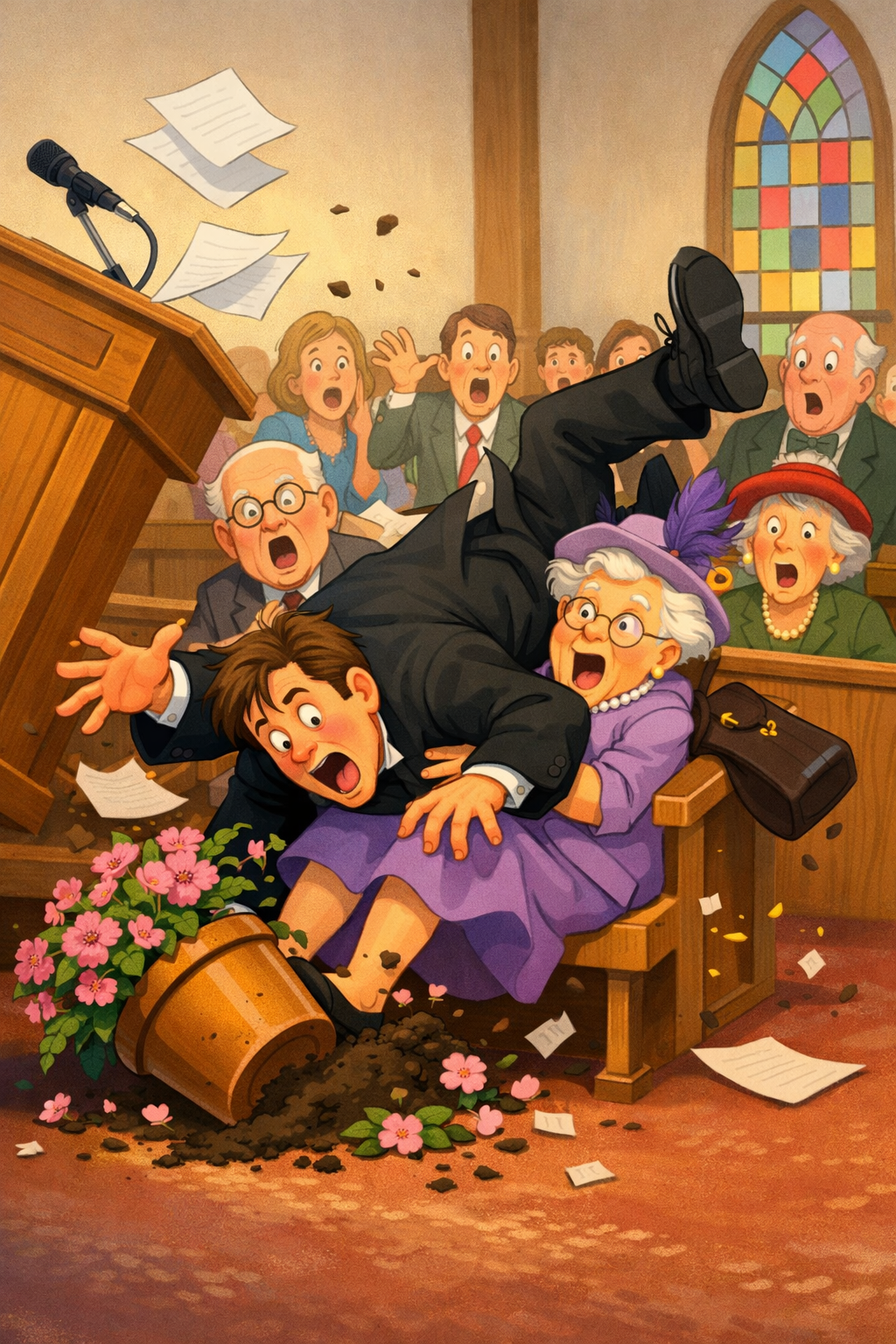 He tried one more time — speaking and gesturing with such force that he fell forward, knocking the pulpit to one side, tripping over the flower pot, and falling into the lap of a little old lady in the front row.