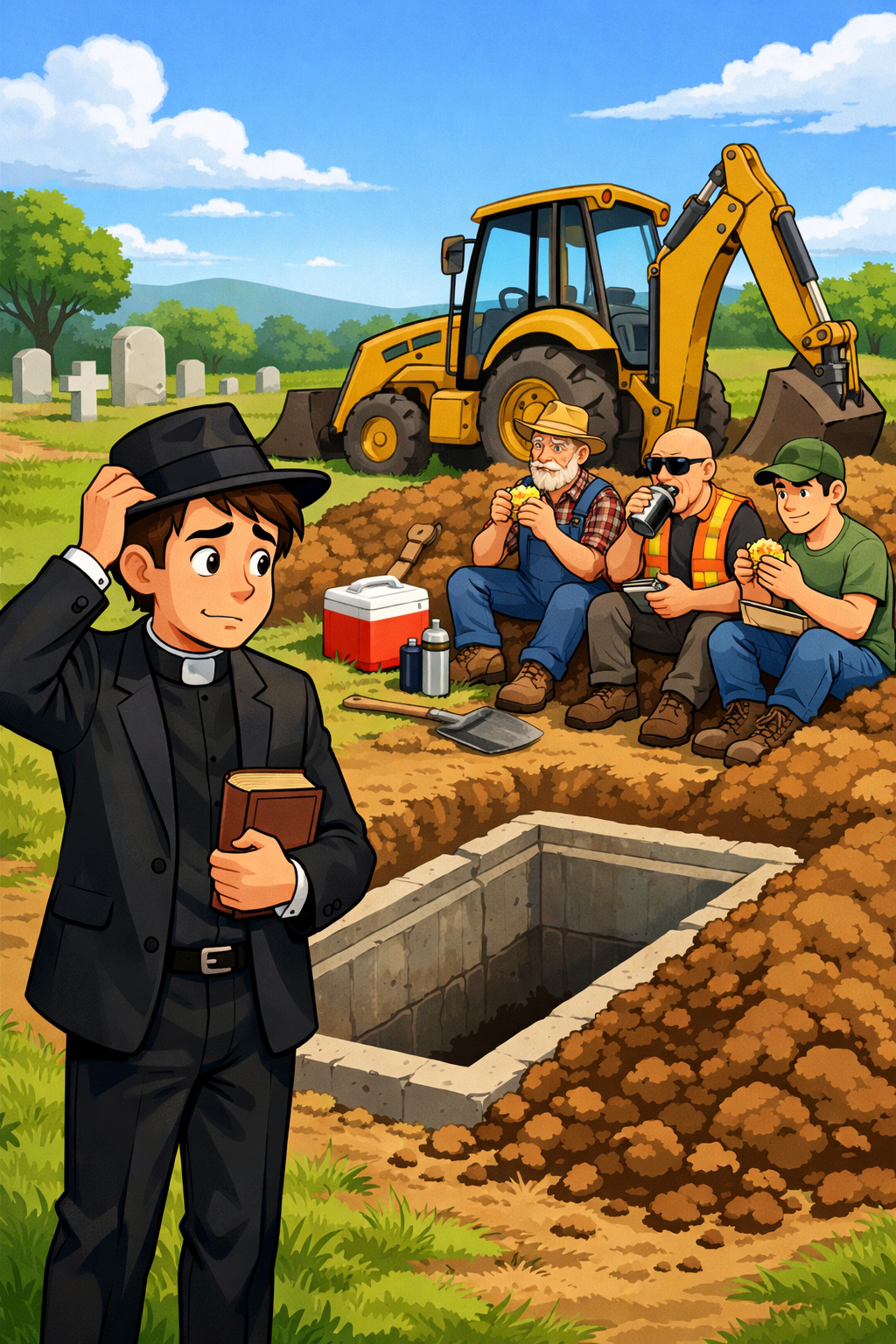 A young preacher was asked by the local funeral director to hold a graveside burial service at a small local cemetery for someone with no family or friends. The preacher started early but quickly got himself lost, making several wrong turns. Eventually, a half-hour late, he saw a backhoe and its crew, but the hearse was nowhere in sight, and the workmen were eating lunch.