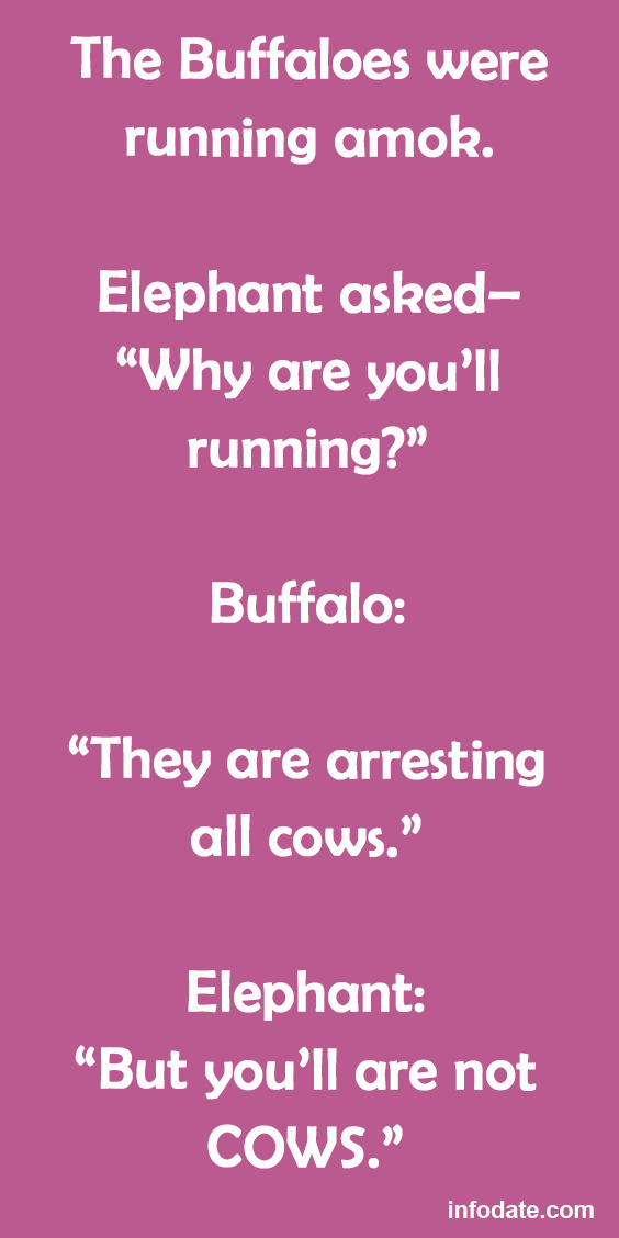 The Buffaloes Were Running Amok. November 12, 2025 by admin Facebook Twitter Pinterest WhatsApp0sharesThe Buffaloes were running amok. Elephant asked– “Why are you’ll running?” Buffalo: “They are arresting all cows.” Elephant: “But you’ll are not COWS.” Buffalo: “It will take atleast few years to prove that in a court!” The Elephant started running! Facebook Twitter Pinterest WhatsApp0shares