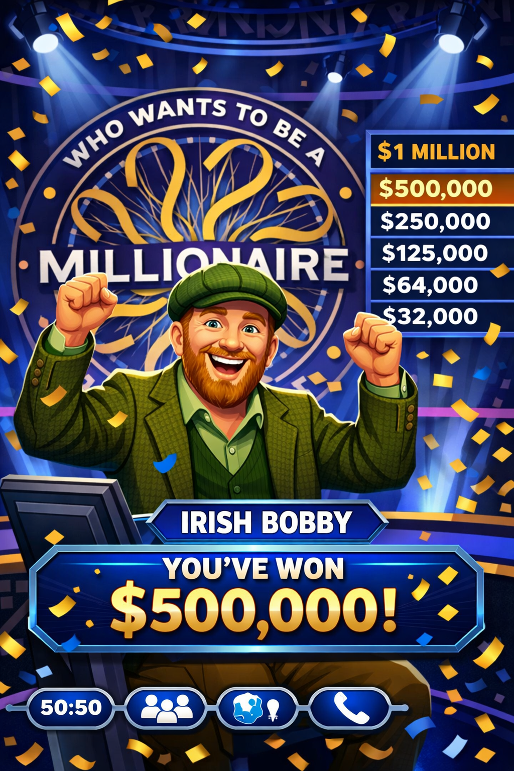 Irish Bobby appeared on “Who Wants To Be A Millionaire” and, towards the end of the program, had already won $500,000. “You’ve done very well so far,” said Chris Tarrant, the show’s presenter, “but you’ve only got one lifeline left, phone a friend. Everything is riding on this question. Will you go for it?” “Sure,” said Bobby. “I’ll have a go!”