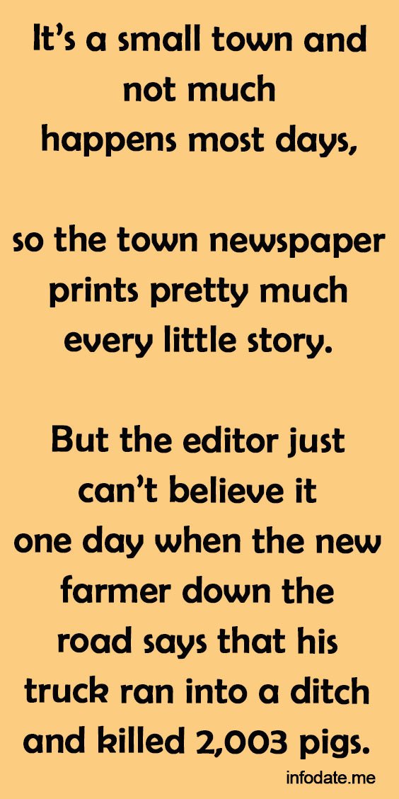 But the editor just can’t believe it one day when the new farmer down the road says that his truck ran into a ditch and killed 2,003 pigs.