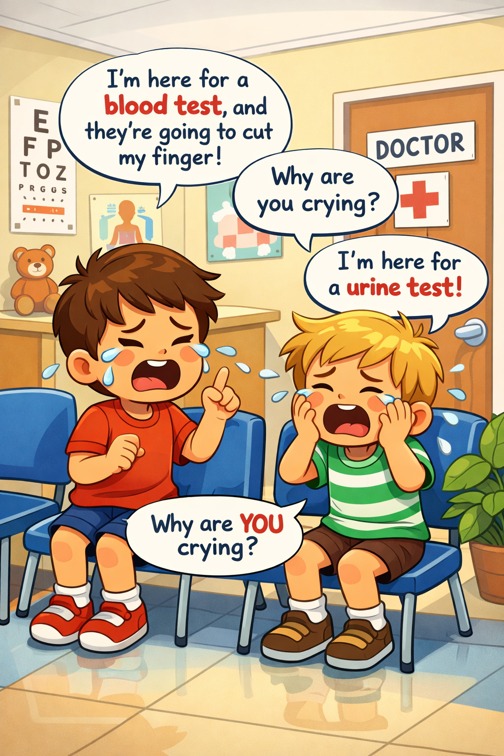Two children are in a doctor’s waiting room, and one of them is crying. “Why are you crying?” asked the other child. “I’m here for a blood test, and they’re going to cut my finger.” When he heard this, the other child started to cry. “Why are you crying?” “I’m here for a urine test.”